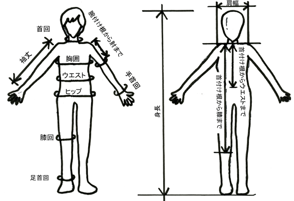 | ◆別注商品をご依頼されます場合、上記の図に記載されている各部分の正確な寸法(cm)が必要となります。 ※@〜Mまでの各部分のヌード寸法(cm)を採寸していただき、お申し付け下さい。 @首回り A胸囲(バスト) Bウエスト Cヒップ D膝回 E足首回 F手首回 G袖丈 H腕付け根から肘まで I肩幅 K首付け根からウエストまで L首付け根から膝まで M身長 |