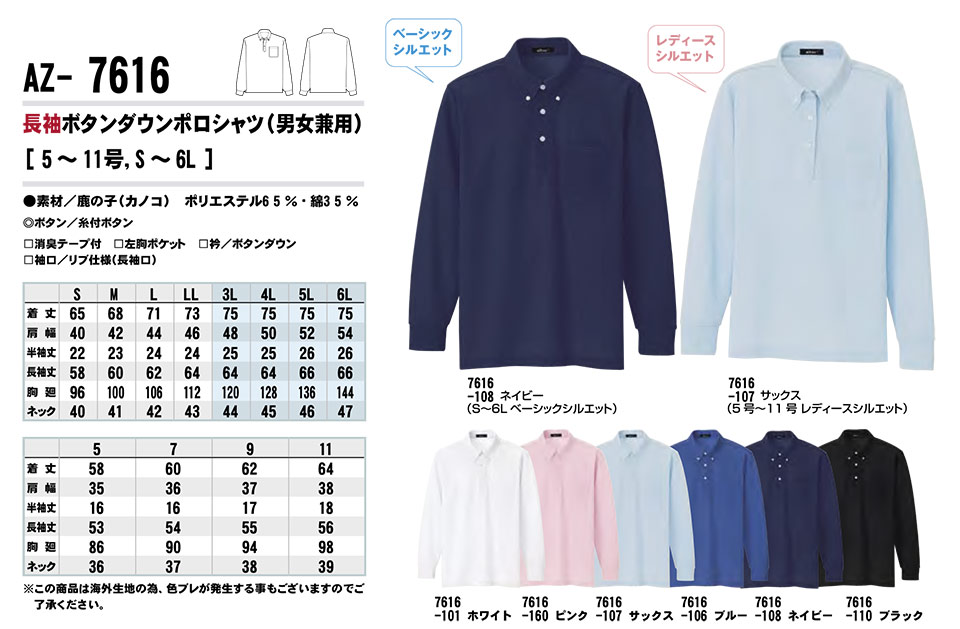 | 長袖ボタンダウンポロシャツ(男女兼用)/AZ-7616 |