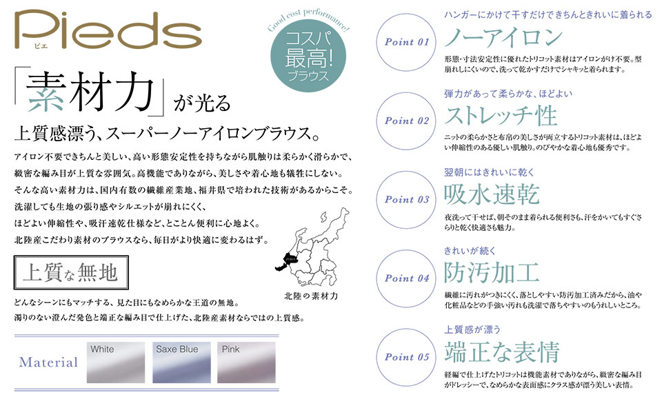吸汗速乾・ストレッチ・ノーアイロン・透け防止