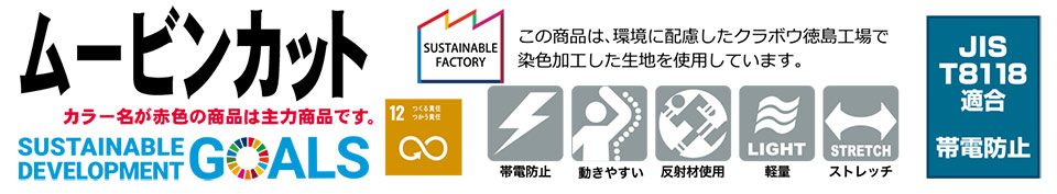 帯電防止・ストレッチ・軽量素材・通気性・遮熱性 |