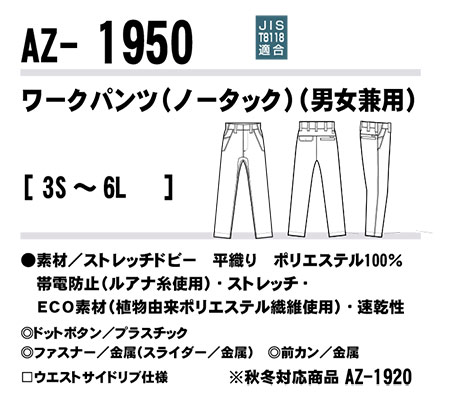 | ワークパンツ(ノータック)(男女兼用)/AZ-1950 |