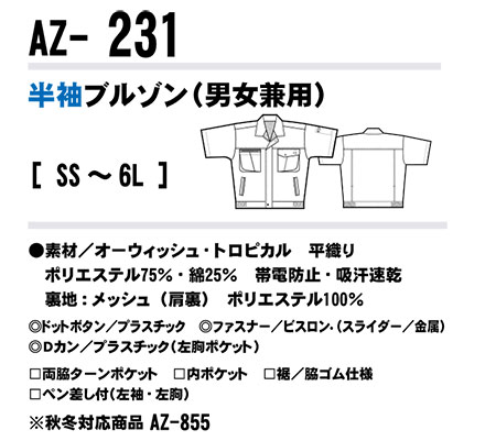 | 半袖ブルゾン(男女兼用)/AZ-231 |