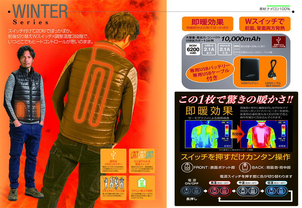 アタックベース (ATACK BASE) 秋・冬シーズン用ユニフォーム(防寒) 40000/Wスイッチヒートベスト バッテリーセット