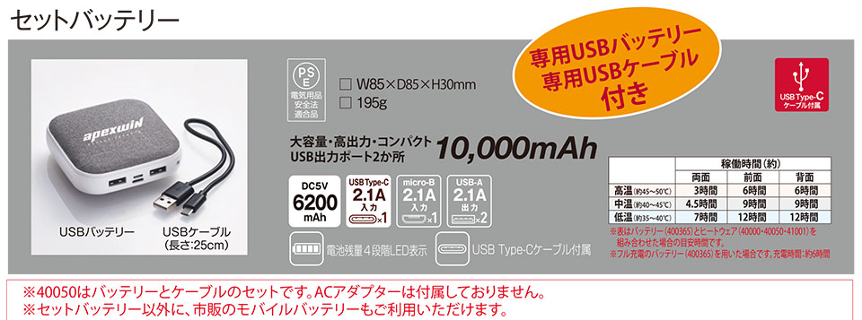 40050/Wスイッチヒートインナーベスト バッテリーセット