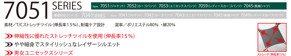 T/Cストレッチツイル(伸長率15%)、制電ケア設計 |