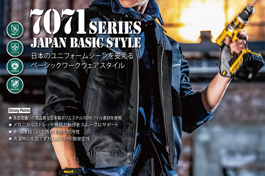 高密度ツイル、スーパー撥水加工、制電ケア設計