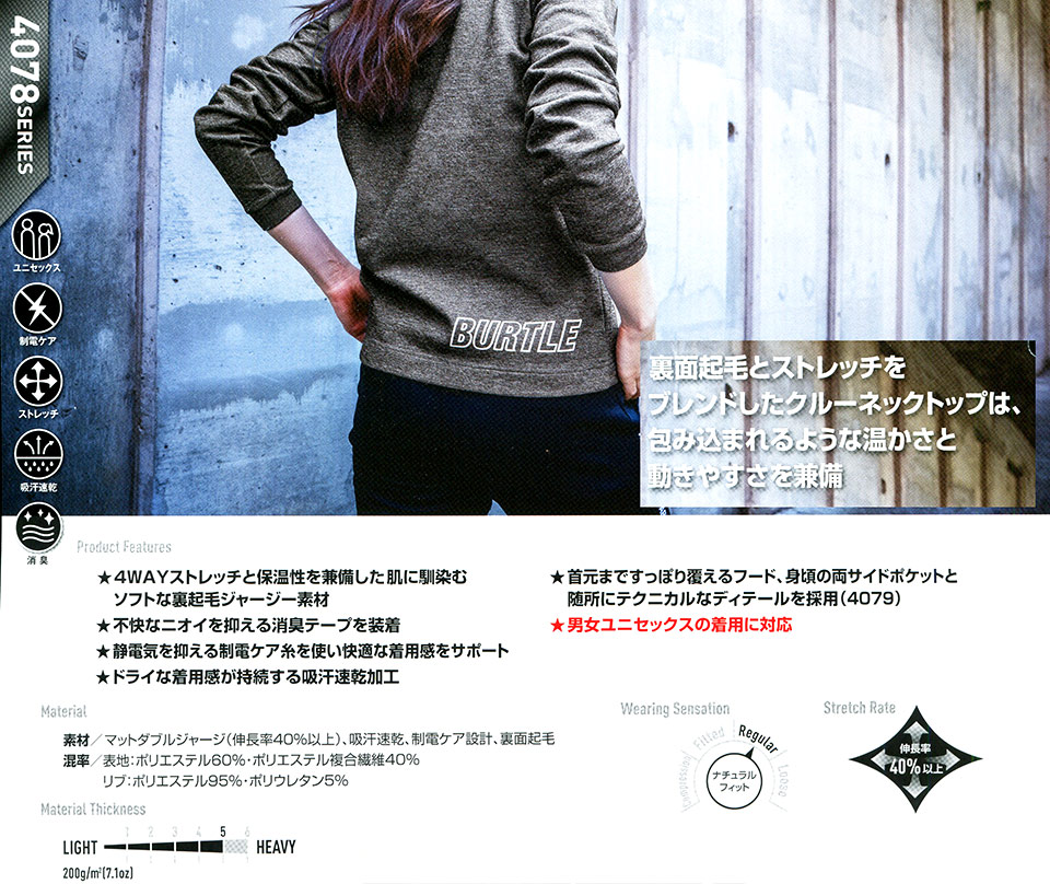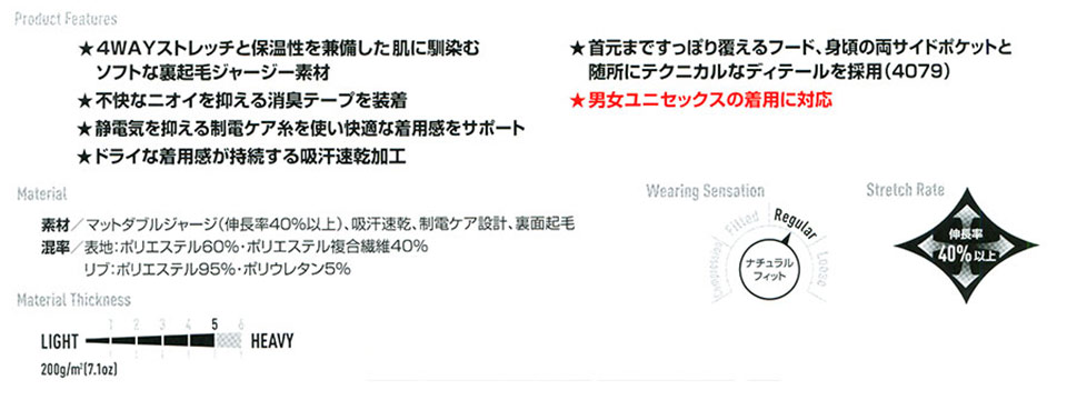 吸汗速乾、制電ケア設計、裏面起毛 |