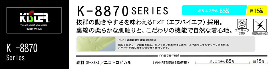 ポリエステル85%・綿15%(再生PET繊維62%使用) |
