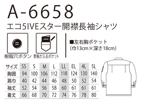 A-6658/エコ5IVEスター開襟長袖シャツ |