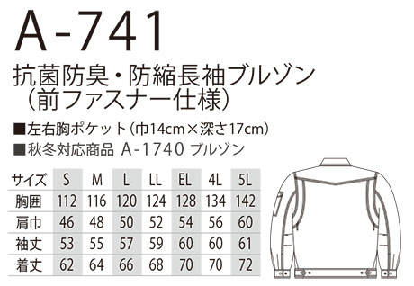A-741/抗菌防臭・防縮長袖ブルゾン(前ファスナー仕様) |