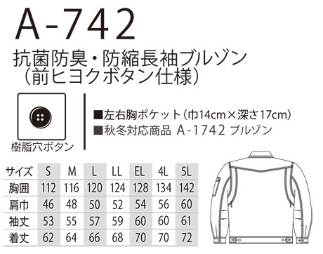 A-742/抗菌防臭・防縮長袖ブルゾン(前ヒヨクボタン仕様) |