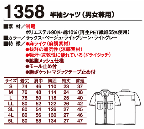 1358/半袖シャツ(男女兼用) |