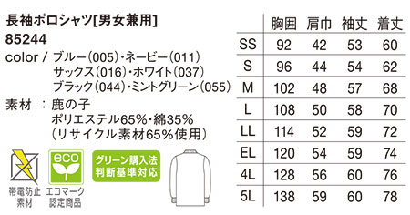 85244/長袖ポロシャツ[男女兼用] |
