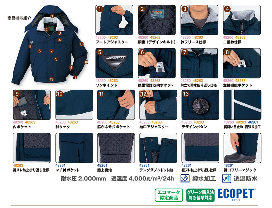 保温力、撥水力、浸湿性、耐久力などの機能性は、過酷な環境の中でも仕事力を最大限に発揮させる。 |