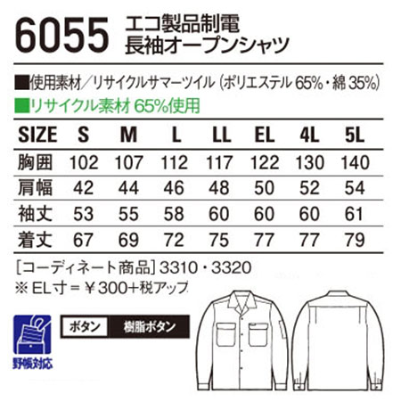 6055/エコ製品制電長袖オープンシャツ |