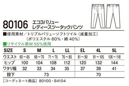 80106/エコ3バリューレディースツータックパンツ |