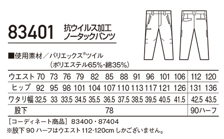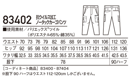 83402/抗ウイルス加工ノータックカーゴパンツ |