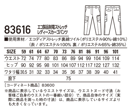 83616/エコ製品制電ストレッチレディースカーゴパンツ |