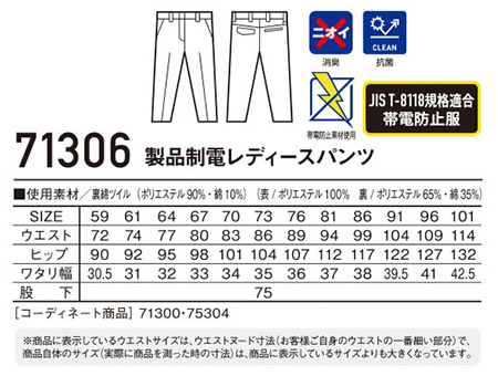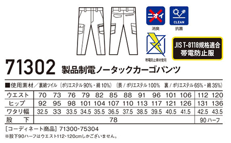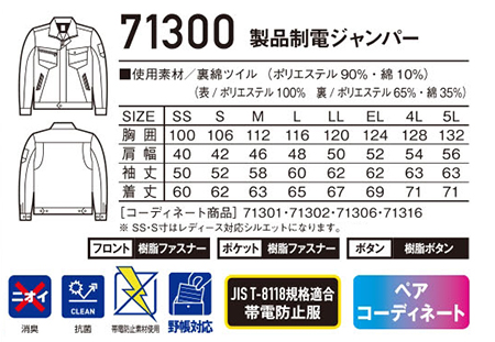 (71300シリーズ/ソフトな風合いが魅力の裏綿素材。帯電防止 JIS T8118 適合ウェア) |
