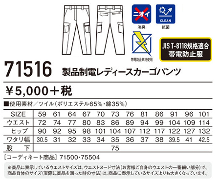 75516/製品制電レディスカーゴパンツ |