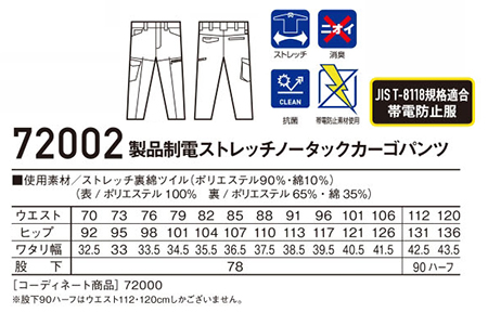 72002/製品制電ストレッチノータックカーゴパンツ |