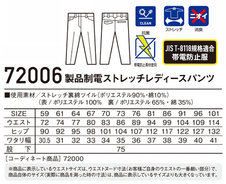 72006/製品制電ストレッチレディースパンツ |