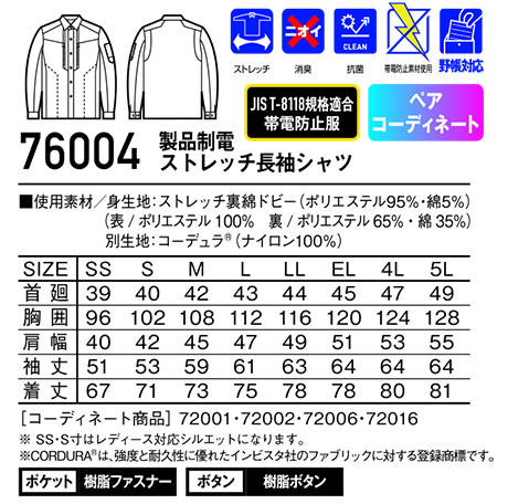 76004/製品制電ストレッチ長袖シャツ |