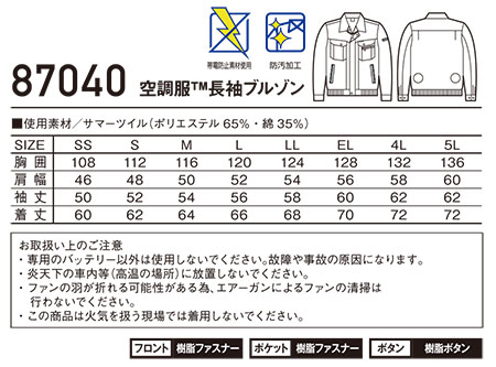 自重堂の作業服(春・夏)空調服 87040/空調服TM長袖ブルゾン