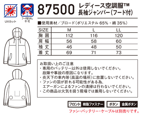 87500/レディース空調服® 長袖ジャンパー(フード付)