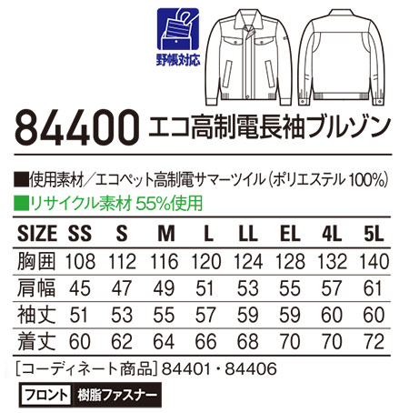 84400/エコ高制電長袖ブルゾン |