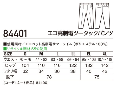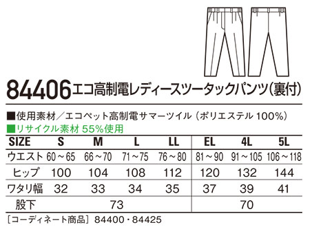 84406/エコ高制電レディースツータックパンツ(裏付) |
