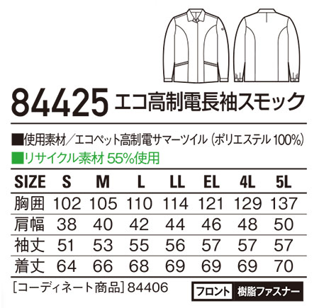 84425/エコ高制電長袖スモック(フロントファスナー仕様) |
