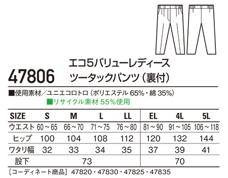 47806/エコ5バリューレディースツータックパンツ(裏付) |