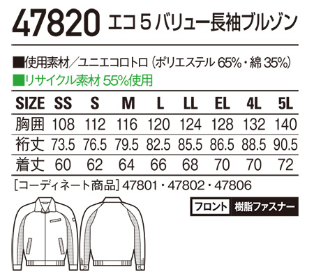47820/エコ5バリュー長袖ブルゾン |