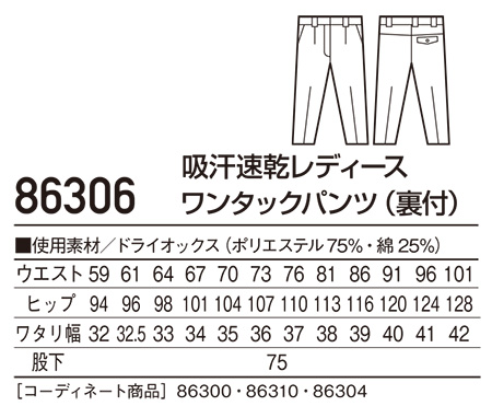 86306/吸汗速乾レディースワンタックパンツ(裏付) |
