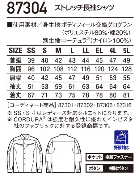 87304/ストレッチ長袖シャツ |