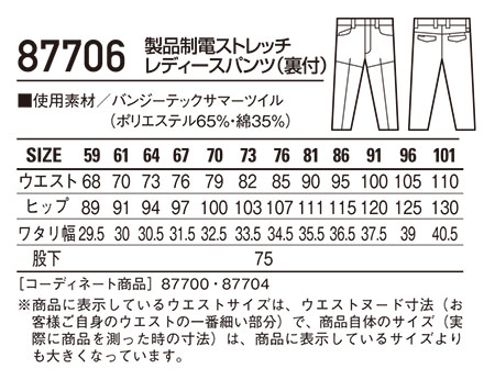 87706/製品制電ストレッチレディースパンツ(裏付) |