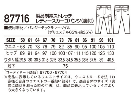 87716/製品制電ストレッチレディースカーゴパンツ(裏付) |