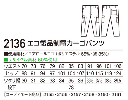 2136/エコ製品制電カーゴパンツ |