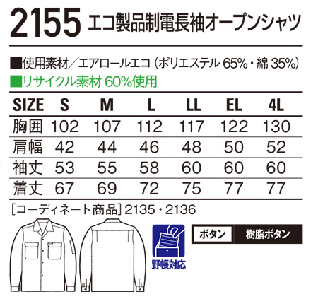 8155/エコ製品制電長袖オープンシャツ |