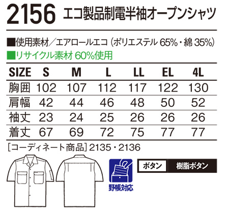 2156/エコ製品制電半袖オープンシャツ |