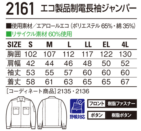2161/エコ製品制電長袖ジャンパー |
