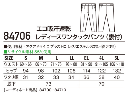 84706/エコ吸汗速乾レディースワンタックパンツ(裏付) |