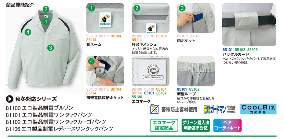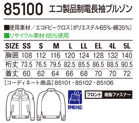 85100/エコ製品制電長袖ブルゾン |