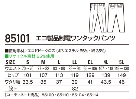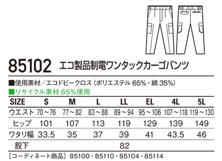 85102/エコ製品制電ワンタックカーゴパンツ |