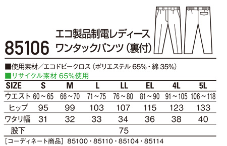 85106/エコ製品制電レディースワンタックパンツ(裏付) |