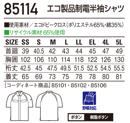 85114/エコ製品制電半袖シャツ |