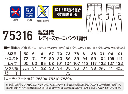 75316/製品制電レディースカーゴパンツ(裏付) |