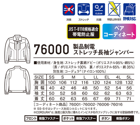 76000/製品制電ストレッチ長袖ジャンパー |