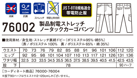 76002/製品制電ストレッチノータックカーゴパンツ |